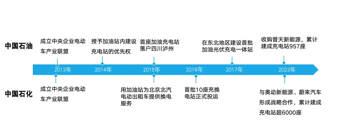 2014年,中國石油授予中國資源交通集團(tuán)在廣東、河南近2000座加油站內(nèi)建設(shè)充電站優(yōu)先權(quán);2015年,油電綜合能源站落戶四川瀘州,可同時為30輛電動汽車提供充電服務(wù);2017年,與普天新能源、大連普達(dá)新能源啟動合作,在東北地區(qū)建設(shè)首批加油光伏充電一體站。2015年,中國石化與北汽新能源攜手,在北京試運(yùn)行了第一座充電站,并著手利用加油站為北汽電動出租車提供換電服務(wù);2016年,首批10座充換電站正式投入使用。