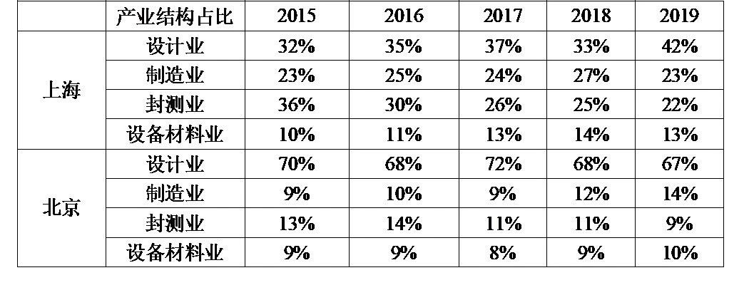 (2)產(chǎn)業(yè)結(jié)構(gòu)比較。從產(chǎn)業(yè)結(jié)構(gòu)來看,如表2所示,上海市集成電路產(chǎn)業(yè)機(jī)構(gòu)更為優(yōu)化和均衡。相比于2015年,上海集成電路設(shè)計業(yè)占比從32%提升到42%,強(qiáng)化了引領(lǐng)作用。而封測業(yè)從36%下降到22%,制造業(yè)和設(shè)備材料業(yè)占比保持相對穩(wěn)定,可以看出整體產(chǎn)業(yè)結(jié)構(gòu)的演進(jìn)是在逐步完善的。而北京的產(chǎn)業(yè)結(jié)構(gòu)相比之下略顯失衡,設(shè)計業(yè)從2015年占據(jù)70%下降到2019年的67%,而制造、封測、設(shè)備材料業(yè)均在10%左右,說明北京仍然面臨著產(chǎn)業(yè)各環(huán)節(jié)發(fā)展不均衡,具有明顯產(chǎn)業(yè)短板的問題。