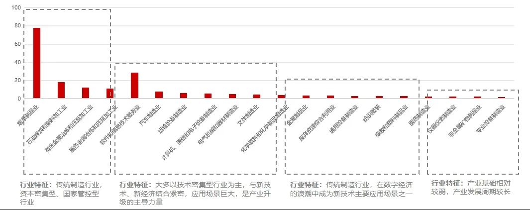第三類是3<固定資產投資效率<5,主要特征是傳統(tǒng)制造行業(yè),在數字經濟的浪潮中成為新技術主要應用場景之一。主要行業(yè)包括化學原料和化學制品制造業(yè)、金屬制品業(yè)、通用設備制造業(yè)、紡織服裝業(yè)等。