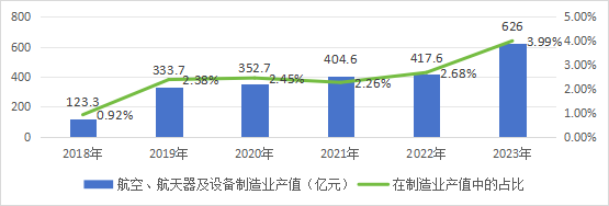圖1 近5年北京航空、航天器及設(shè)備制造業(yè)產(chǎn)值及占比情況