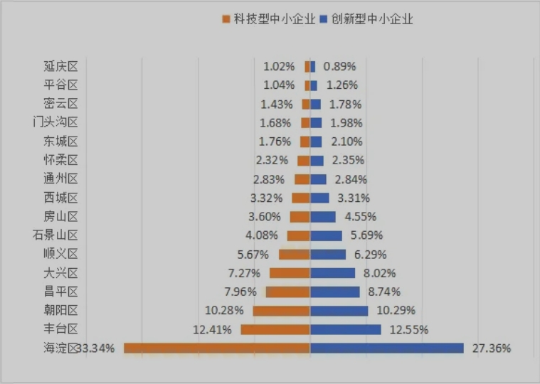 圖1 北京市科技型中小企業(yè)和創(chuàng)新型中小企業(yè)區(qū)域分布 2.兩類企業(yè)培育導(dǎo)向基本一致,創(chuàng)新型中小企業(yè)指標(biāo)體系覆蓋面更廣。 科技型中小企業(yè)和創(chuàng)新型中小企業(yè)的評價指標(biāo)均關(guān)注企業(yè)研發(fā)創(chuàng)新活動、研發(fā)成果產(chǎn)出情況,在研發(fā)投入、知識產(chǎn)權(quán)產(chǎn)出上分別設(shè)置計分指標(biāo)。科技創(chuàng)新型中小企業(yè)在研發(fā)活動上設(shè)置科技人員指標(biāo),考核科技人員占企業(yè)職工總數(shù)的比例,更聚焦于企業(yè)本身在研發(fā)活動上的要素投入。創(chuàng)新型中小企業(yè)同時要考核企業(yè)的成長性和專業(yè)度,對企業(yè)主營業(yè)務(wù)收入、資產(chǎn)負(fù)債率、主導(dǎo)產(chǎn)品所屬領(lǐng)域和產(chǎn)生收入占比情況設(shè)置計分指標(biāo)。 這種差異從直通指標(biāo)設(shè)置中也可體現(xiàn),兩類企業(yè)如獲得高級別科技獎勵、擁有其他科技創(chuàng)新類企業(yè)資質(zhì)、成立省部級研發(fā)機構(gòu)均可獲得直通資格。不同的是,對將先進(jìn)技術(shù)轉(zhuǎn)化為標(biāo)準(zhǔn)、在市場形成一定自我保護(hù)壁壘的中小企業(yè)設(shè)置給予科技型中小企業(yè)稱號“直通車”資格(主導(dǎo)制定過國際標(biāo)準(zhǔn)、國家標(biāo)準(zhǔn)或行業(yè)標(biāo)準(zhǔn)),對在資本市場獲得了認(rèn)可的、擁有一定資本實力的中小企業(yè)可獲得創(chuàng)新型中小企業(yè)稱號“直通車”資格(近三年內(nèi)新增股權(quán)融資總額(合格機構(gòu)投資者的實繳額)500萬元以上)。 3.兩類企業(yè)創(chuàng)新目的不同,在創(chuàng)新能力和產(chǎn)業(yè)支撐方面各有側(cè)重。 科技型中小企業(yè)更多考慮處于研發(fā)階段且暫未形成一定經(jīng)濟(jì)收入的企業(yè),如在研發(fā)費用投入上設(shè)置二選一靈活指標(biāo),企業(yè)可自行選擇研發(fā)費用與銷售收入和成本費用支出相比較取得優(yōu)勢指標(biāo)。在科研人員上的關(guān)注同樣體現(xiàn)出科技型中小企業(yè)對研發(fā)投入上的傾斜,不僅要求企業(yè)投入更多的研發(fā)資金,在科研人員力量配備上也同步提出要求并作為門檻條件(科技人員指標(biāo)得分不得為0分)的強制要求,體現(xiàn)科技型中小企業(yè)的研發(fā)屬性。創(chuàng)新型中小企業(yè)僅設(shè)置了研發(fā)費占營業(yè)收入比例這一個選項。 在科技創(chuàng)新成果產(chǎn)出方面,對于企業(yè)獲得知識產(chǎn)權(quán)情況,科技型中小企業(yè)根據(jù)獲得Ⅱ類知識產(chǎn)權(quán)數(shù)據(jù)可在此項指標(biāo)中得到20%—80%的分?jǐn)?shù),1項I類知識產(chǎn)權(quán)即可獲得滿分,對處于研發(fā)期的中小企業(yè)更加友好,而創(chuàng)新型中小企業(yè)如僅Ⅱ類知識產(chǎn)權(quán),僅可獲得12.5%的分?jǐn)?shù),無關(guān)數(shù)量,想取得更高分?jǐn)?shù)需要獲得更高價值專利,如高價值I類專利或者自主研發(fā)的I類知識產(chǎn)權(quán)。同時認(rèn)定企業(yè)所屬產(chǎn)業(yè)為新一代信息技術(shù)、生物、高端裝備制造、新能源、新材料等戰(zhàn)略新興產(chǎn)業(yè)且已初具規(guī)模形成較好的經(jīng)濟(jì)收益,對企業(yè)能否支撐產(chǎn)業(yè)發(fā)展有更高的要求。 4.兩類企業(yè)培育路徑均呈“階梯型”,主管部門職責(zé)不同影響資源配置效率和效果。 創(chuàng)新型中小企業(yè)是工業(yè)和信息化部優(yōu)質(zhì)中小企業(yè)梯度培育的第一級,也是企業(yè)走“專精特新”之路的第一步,企業(yè)資質(zhì)認(rèn)定后即正式進(jìn)入梯度培育體系,沿著“創(chuàng)新型中小企業(yè)—專精特新企業(yè)—國家小巨人企業(yè)-隱形冠軍/單項冠軍”道路發(fā)展??萍夹椭行∑髽I(yè)同樣可看作科學(xué)技術(shù)部的對于科技型企業(yè)培育工作的第一級,企業(yè)按照“科技型中小企業(yè)—高新企業(yè)—獨角獸企業(yè)”階梯向上發(fā)展。 根據(jù)現(xiàn)有政策和培育體系,兩者在“攀爬”階梯過程中,每升一級都可獲得更加精準(zhǔn)、適合和力度更強的發(fā)展支撐,通過分析近年來針對兩類企業(yè)出臺的政策,在知識產(chǎn)權(quán)、人才引進(jìn)、研發(fā)及成果轉(zhuǎn)化、數(shù)智轉(zhuǎn)型和金融支持上均有支持,對于能提供培育資源的載體,如孵化器之于科技型中小企業(yè),示范平臺及示范基地、專精特新工作站、專精特新園區(qū)之于創(chuàng)新型中小企業(yè),均有相關(guān)政策或資金支持??萍夹椭行∑髽I(yè)獨有的研發(fā)費用加計扣除、延長虧損結(jié)轉(zhuǎn)年限等政策和創(chuàng)新型中小企業(yè)后續(xù)可享受的上市融資、品牌培育、融鏈補鏈等政策的獨有性,也根據(jù)認(rèn)定主管部門的自身職責(zé)提供政策支持。 5.兩類企業(yè)在產(chǎn)業(yè)鏈融通中均具有重要的支撐作用,但扮演角色和融鏈環(huán)節(jié)不同。 科技型中小企業(yè)與創(chuàng)新型中小企業(yè)在企業(yè)融通中均體現(xiàn)出重要的支撐作用,科技型中小企業(yè)功能聚焦在研發(fā)創(chuàng)新,更利于產(chǎn)業(yè)科技創(chuàng)新發(fā)展。相較而言,創(chuàng)新型中小企業(yè)在融鏈時可在多個環(huán)節(jié)形成支撐,且可在企業(yè)自身內(nèi)部形成