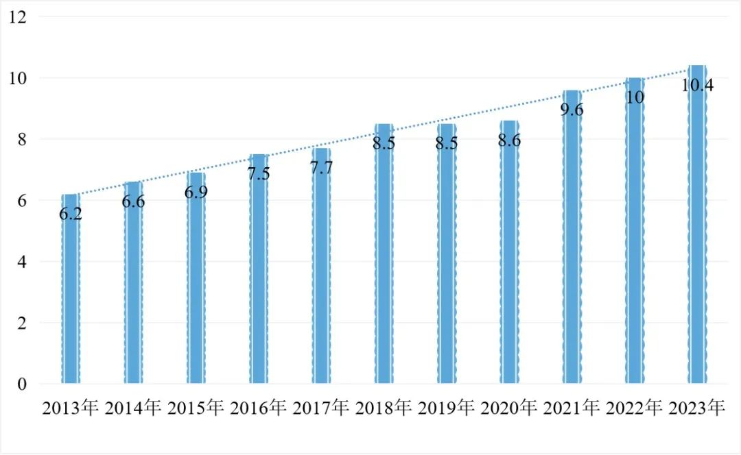圖3 2013年-2023年京津冀地區(qū)生產(chǎn)總值(可比價)(萬億元)