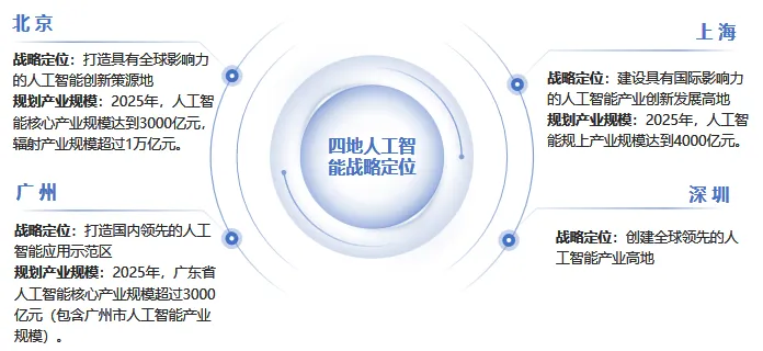 北上廣深四地均將發(fā)展人工智能作為重要戰(zhàn)略,聚焦打造國內(nèi)領(lǐng)先、國際一流的人工智能產(chǎn)業(yè)高地,通過政策體系引領(lǐng),推動人工智能高質(zhì)量發(fā)展、各領(lǐng)域全方位應(yīng)用。北京市致力打造具有全球影響力的人工智能創(chuàng)新策源地,規(guī)劃2025年人工智能核心產(chǎn)業(yè)規(guī)模突破3000億元,帶動形成超萬億元的產(chǎn)業(yè)規(guī)模。上海市聚焦構(gòu)筑具有國際影響力的人工智能產(chǎn)業(yè)創(chuàng)新發(fā)展高地,規(guī)劃到2025年實現(xiàn)4000億元的人工智能規(guī)上產(chǎn)業(yè)規(guī)模。廣州市旨在建設(shè)國內(nèi)領(lǐng)先的人工智能應(yīng)用示范區(qū)。深圳市積極打造全球領(lǐng)先的人工智能產(chǎn)業(yè)高地,努力創(chuàng)建人工智能先鋒城市。
