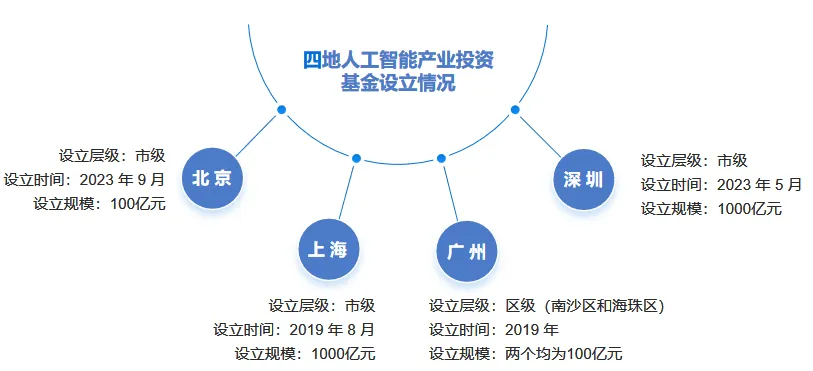 四地均設(shè)立了不同規(guī)模的產(chǎn)業(yè)基金,支持人工智能產(chǎn)業(yè)能級提升、企業(yè)方陣壯大。具體來看,北京、上海和深圳三地設(shè)立市級人工智能產(chǎn)業(yè)投資基金,廣州市設(shè)立區(qū)級人工智能產(chǎn)業(yè)基金(南沙區(qū)和海珠區(qū))。設(shè)立時間上,上海市最早于2019年8月設(shè)立首期100億元的產(chǎn)業(yè)基金,深圳、北京兩地均于2023年設(shè)立?;鹨?guī)模上,上海、深圳兩地人工智能產(chǎn)業(yè)基金規(guī)模遙遙領(lǐng)先,均達到1000億元。