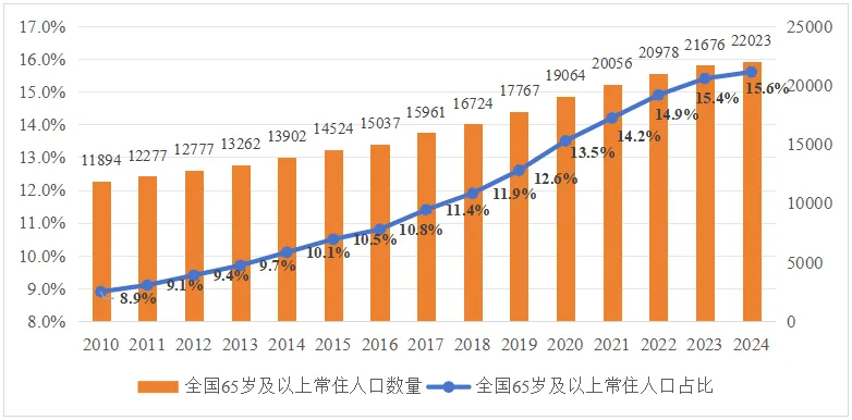 圖1 2010—2024年全國(guó)65歲及以上老年人口規(guī)模及占比情況統(tǒng)計(jì)
