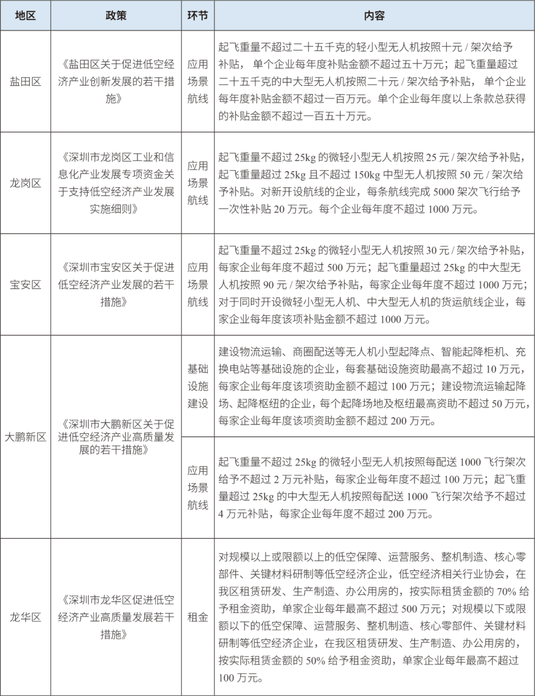 一是謀劃低空經(jīng)濟(jì)頂層設(shè)計。作為經(jīng)濟(jì)特區(qū),深圳充分發(fā)揮獨立立法權(quán)出臺了《深圳市民用無人機(jī)管理暫行辦法(征求意見稿)》等政策法規(guī),從民用無人機(jī)管理、適航認(rèn)證、通航協(xié)調(diào)等方面為無人機(jī)物流發(fā)展提供立法保障。深圳市通過設(shè)立專項資金、給予建設(shè)與運(yùn)營補(bǔ)貼、貼息貸款等方式為無人機(jī)相關(guān)企業(yè)提供資金支持;對于新入駐各區(qū)低空產(chǎn)業(yè)園區(qū)的企業(yè),提供租金補(bǔ)貼,吸引核心零部件企業(yè)落地生產(chǎn)。