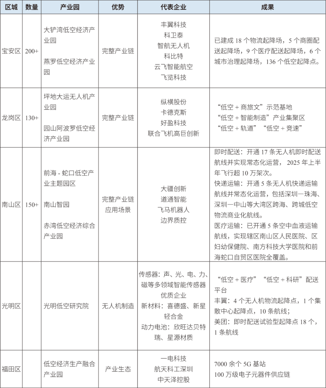 深圳是我國無人機(jī)產(chǎn)業(yè)集聚度最高的地區(qū),各區(qū)依托各自產(chǎn)業(yè)基礎(chǔ)及優(yōu)勢差異化布局開展低空經(jīng)濟(jì)產(chǎn)業(yè)。光明區(qū)依托光明科學(xué)城在信息、生命及新材料方面的優(yōu)勢,發(fā)展無人機(jī)大模型訓(xùn)練、高性能芯片以及新型材料等,重點布局無人機(jī)制造領(lǐng)域。福田區(qū)成立全國首個“低空經(jīng)濟(jì)生態(tài)融合產(chǎn)業(yè)園”并依托“中國電子第一街”華強(qiáng)北打造“熱帶雨林”創(chuàng)新創(chuàng)業(yè)生態(tài),落地全國首家全產(chǎn)業(yè)鏈無人機(jī)設(shè)備選品中心,聚集200多家物流企業(yè),年交易額超2000億元。南山區(qū)設(shè)立三個低空經(jīng)濟(jì)產(chǎn)業(yè)園,分別專注航空器維修等低空業(yè)態(tài)、產(chǎn)業(yè)鏈優(yōu)勢企業(yè)及無人機(jī)產(chǎn)品測驗,同時不斷開拓應(yīng)用場景,在即時配送、快遞運(yùn)輸及醫(yī)療運(yùn)輸?shù)确矫嫘纬闪顺B(tài)化運(yùn)營。鹽田區(qū)及大鵬新區(qū)主要布局eVTOL產(chǎn)業(yè),成立了全國第一個eVTOL產(chǎn)業(yè)園區(qū),建設(shè)了全國首個融合空域運(yùn)行示范基地。