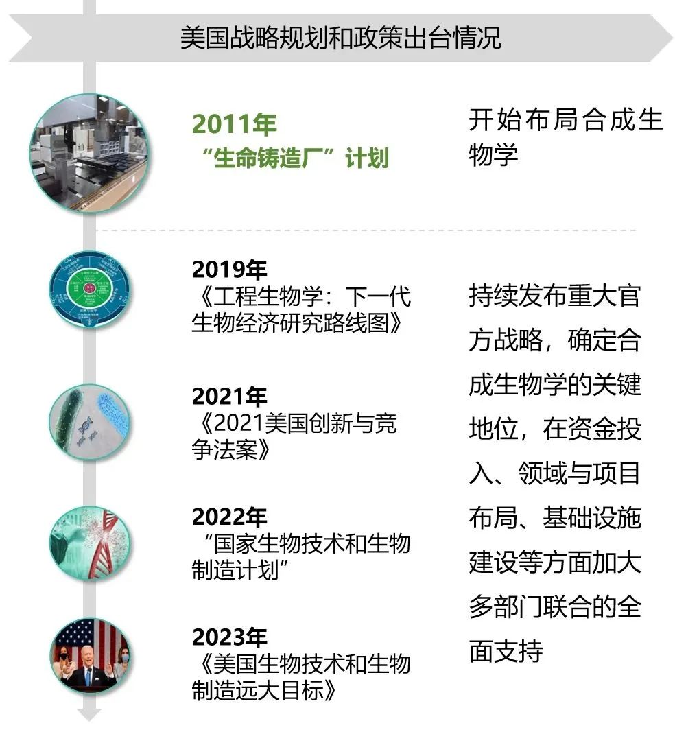 為保持生物技術(shù)在未來幾十年內(nèi)的領(lǐng)先地位,增強(qiáng)生物經(jīng)濟(jì)競爭力,美國持續(xù)加大合成生物學(xué)在醫(yī)藥健康、食品農(nóng)業(yè)、能源環(huán)境、材料化工等領(lǐng)域的技術(shù)創(chuàng)新與應(yīng)用布局。自2011年起,先后發(fā)布眾多戰(zhàn)略支持,積極推進(jìn)合成生物學(xué)的創(chuàng)新發(fā)展。