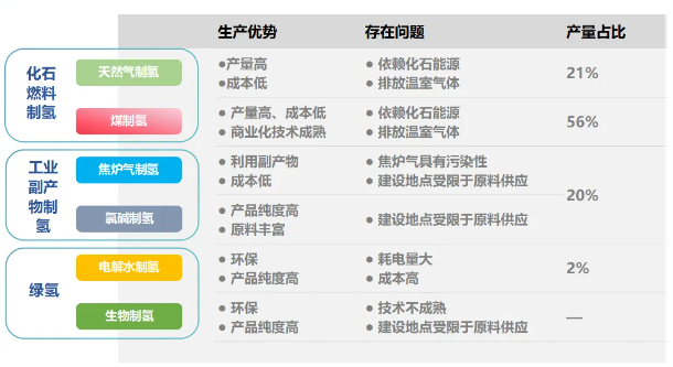 圖2 幾種制氫方式對比及占比