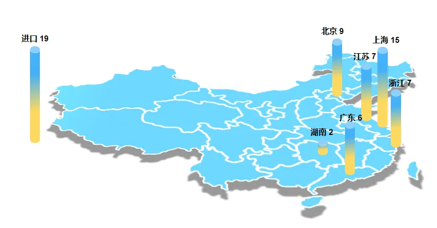 65款獲批產(chǎn)品中,本土46款(占71%)、進(jìn)口19款(占29%),進(jìn)口產(chǎn)品的比例首次升近三成,可見隨著我國創(chuàng)新醫(yī)療器械審批制度不斷與國際接軌,創(chuàng)新醫(yī)療器械市場日益融入全球。本土品種上,上海共獲批15款創(chuàng)新醫(yī)療器械,位居全國第一,領(lǐng)先北京9款,兩地獲批產(chǎn)品數(shù)量合計占比從2023年的33%攀升至2024年37%。進(jìn)口品種上,美國國際引領(lǐng)地位更加突出,獲批數(shù)量(17個)占比近9成,遠(yuǎn)高于2023年的6成;另有德國、日本各1個獲批在國內(nèi)上市。