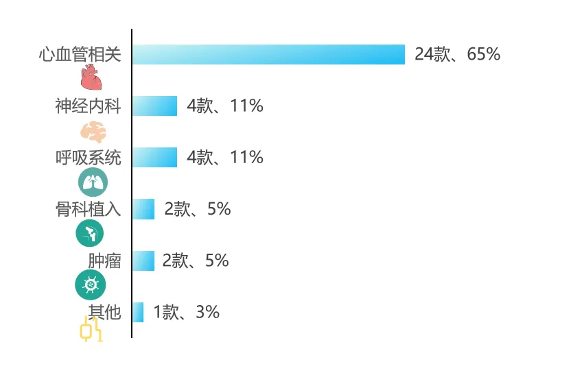 高值耗材創(chuàng)新產(chǎn)品共獲批37款,其中心血管植介入器械呈現(xiàn)“井噴”現(xiàn)象從去年的9款增加到了今年的24款,產(chǎn)品類型以支架和導(dǎo)管為主。