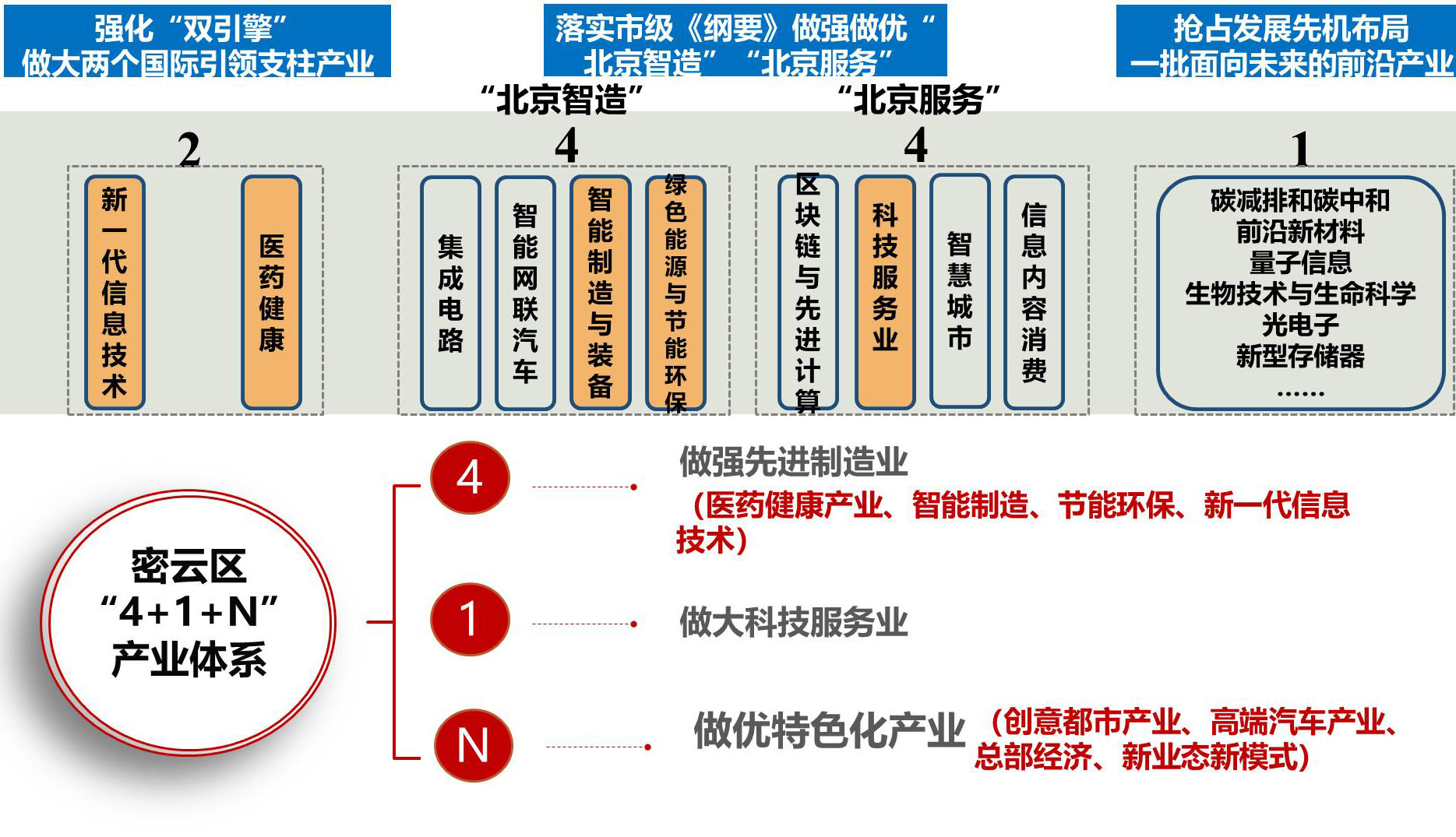 規(guī)劃梳理總結(jié)密云區(qū)高精尖產(chǎn)業(yè)現(xiàn)狀和形勢,根據(jù)市委對生態(tài)涵養(yǎng)區(qū)“不斷擴大生態(tài)環(huán)境容量和提高生態(tài)環(huán)境質(zhì)量”的新要求,提出堅持科技創(chuàng)新、生態(tài)融合兩條主線,加快推進創(chuàng)意都市、汽車零部件等傳統(tǒng)產(chǎn)業(yè)轉(zhuǎn)型升級,以醫(yī)藥健康、智能制造、節(jié)能環(huán)保、新一代信息技術(shù)產(chǎn)業(yè)為主導,以科技服務(wù)業(yè)為支撐,以新業(yè)態(tài)、新模式為補充,構(gòu)建“4+1+N”的高精尖產(chǎn)業(yè)體系和“3+5+4”的高精尖產(chǎn)業(yè)空間體系,推動密云綠色創(chuàng)新發(fā)展示范區(qū)建設(shè)。