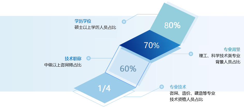 公司為國家高新技術企業(yè),具有雄厚的咨詢技術服務力量,現(xiàn)有員工270余人,其中碩士及以上學歷占80%以上,理工、科學技術類專業(yè)背景人員占比近70%。